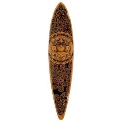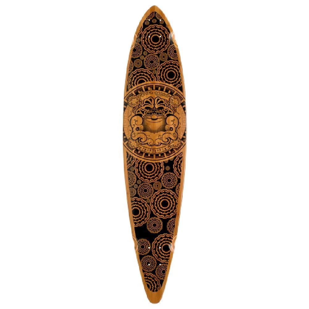 This bamboo pintail longboard has a nice design in brown and black with the God Indra on it. The leader of the gods in early Hindu writings, Indra was said to distribute rain, the elixir of life. Symbolic of courage and strength, his mischievous grin belies his more human side.