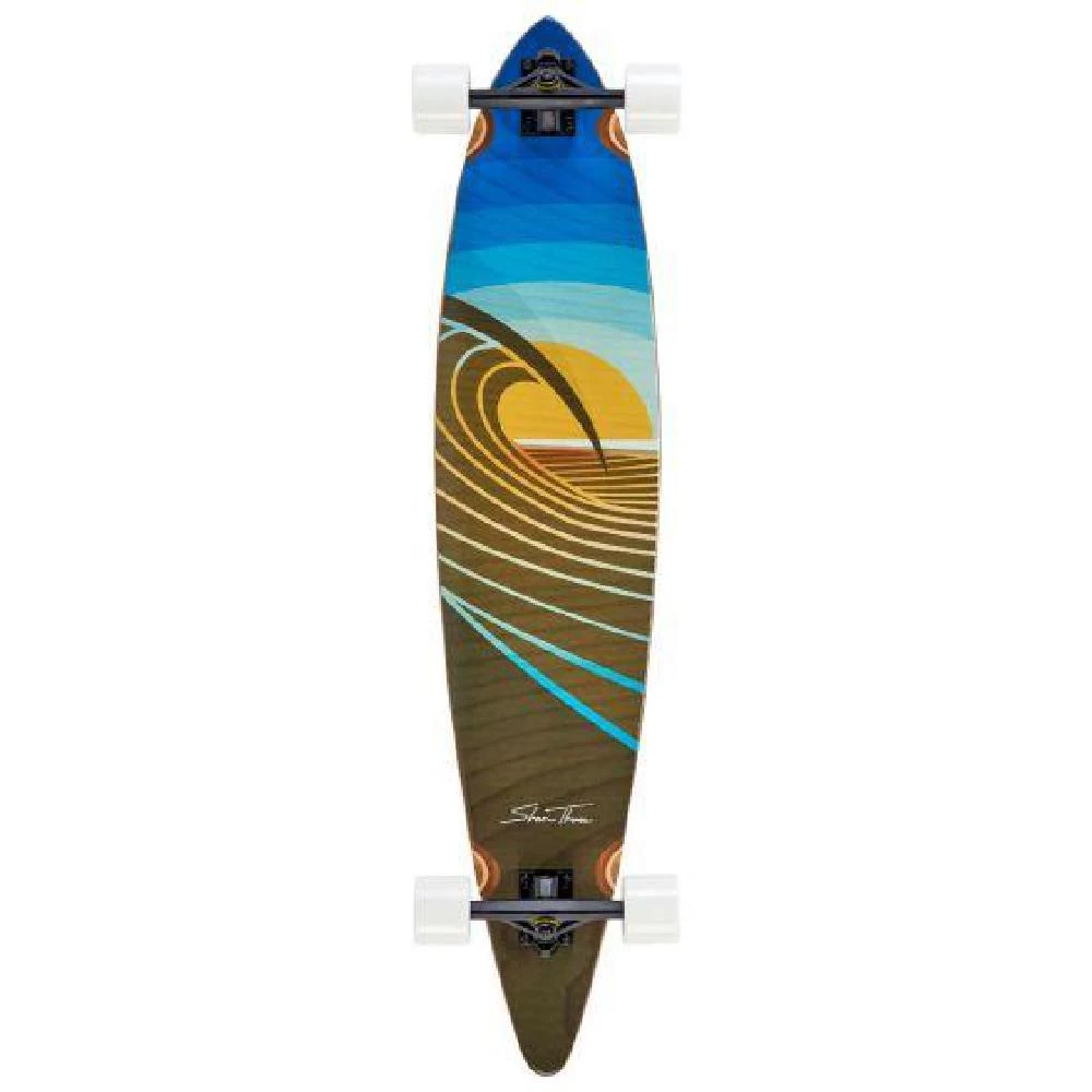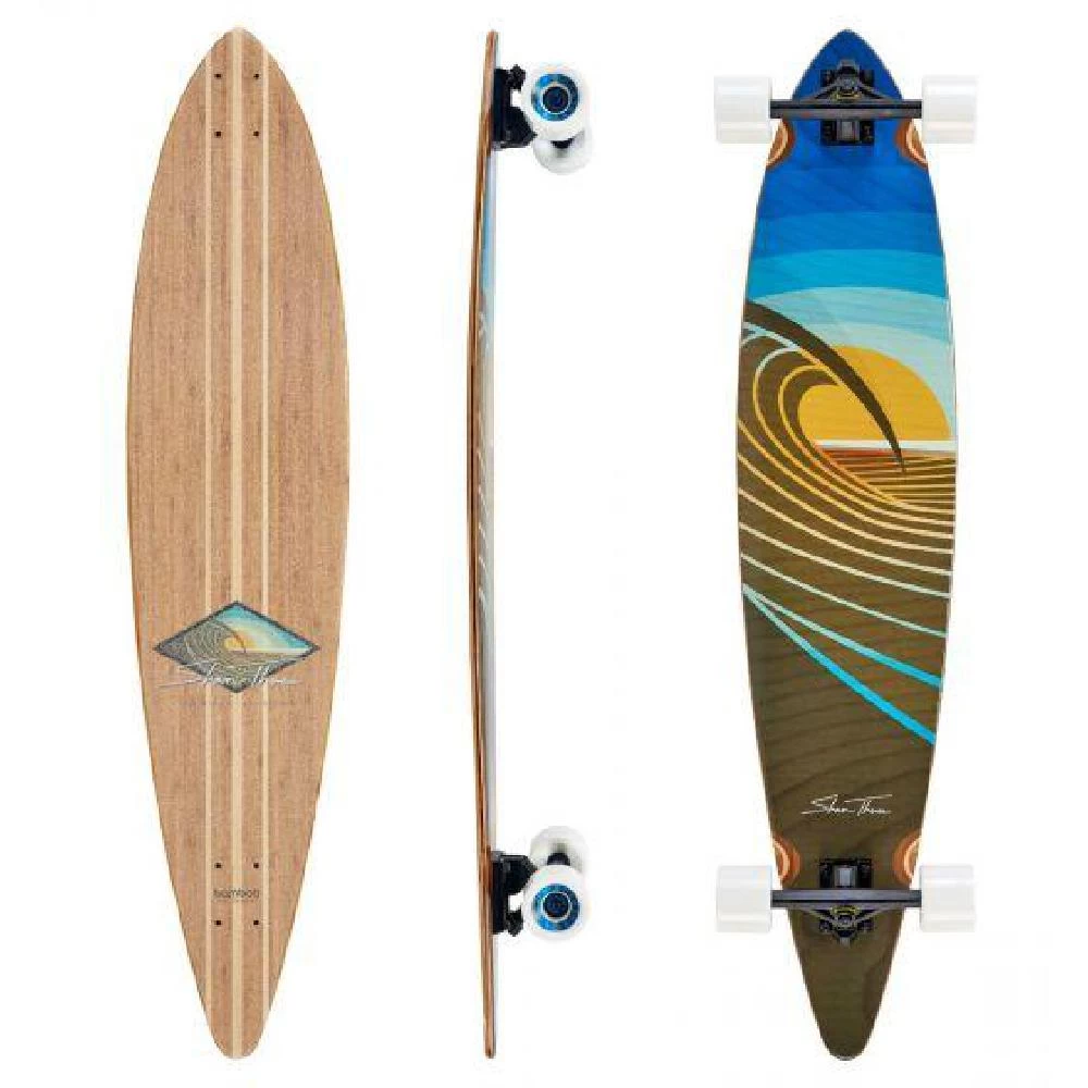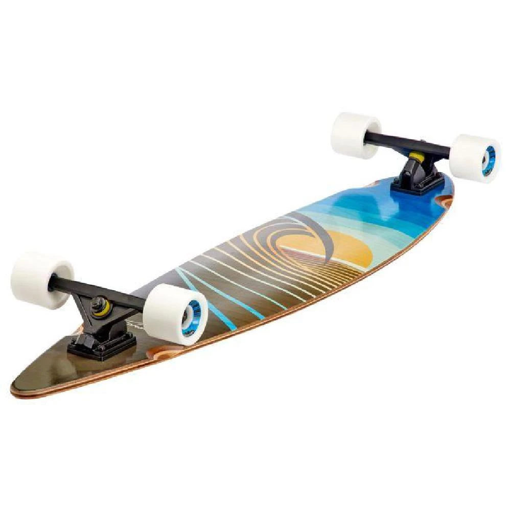 The Peak longboard is equipped with wheel wells and showcases a stunning sunset graphic on a natural board, complemented by white undertow wheels. This complete longboard setup arrives ready to ride, so you can hit the streets in no time. The bamboo inlay not only adds durability, but also contributes to a unique aesthetic. Ideal for cruising, carving, and commuting, this Pintail Sunset Peak longboard is a fantastic choice for those seeking an enjoyable and reliable ride with an added touch of elegance.