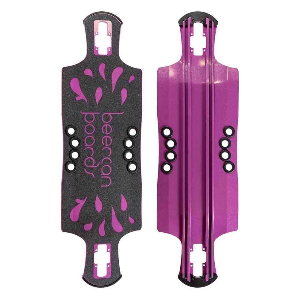 This hybrid deck boasts minimal lateral and torsional flex, while the platform drop provides enhanced stability at all speeds. The Oat Soda deck features eco-friendly “Bottle Caps” nose guards, custom die-cut grip tape, and a durable powder coat finish. Elevate your longboarding experience with the eye-catching Beercan Purple 35″ Oat Soda Drop Through Longboard Deck.