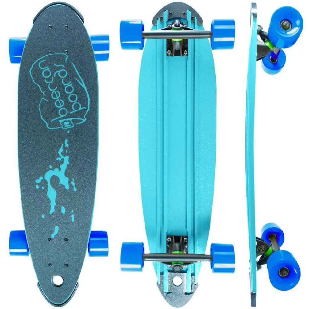 The 30″ Sea Foam Green Pin Tail is our latest and most economical board. With its low price and a great list of features, it is ideal for beginners, or just for easy cruising. Pin Tail features a classic surf-inspired design with a wide base and pointed nose and tail. The slim pintail shape gives a streamlined ride with Bear trucks holding signature Beercan Boards wheels for improved maneuverability and comfort. The recycled aluminum construction gives the board optimum flexibility while remaining almost impossible to destroy.