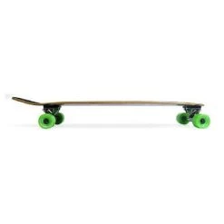 This board comes complete with green wheels and is ready to ride.