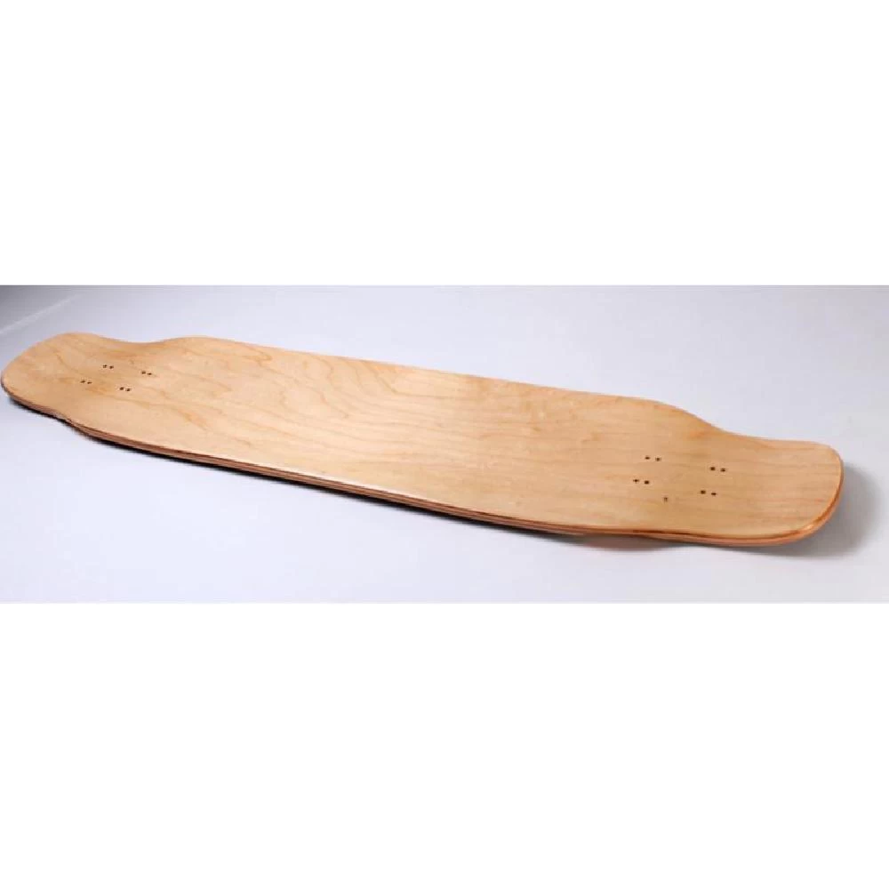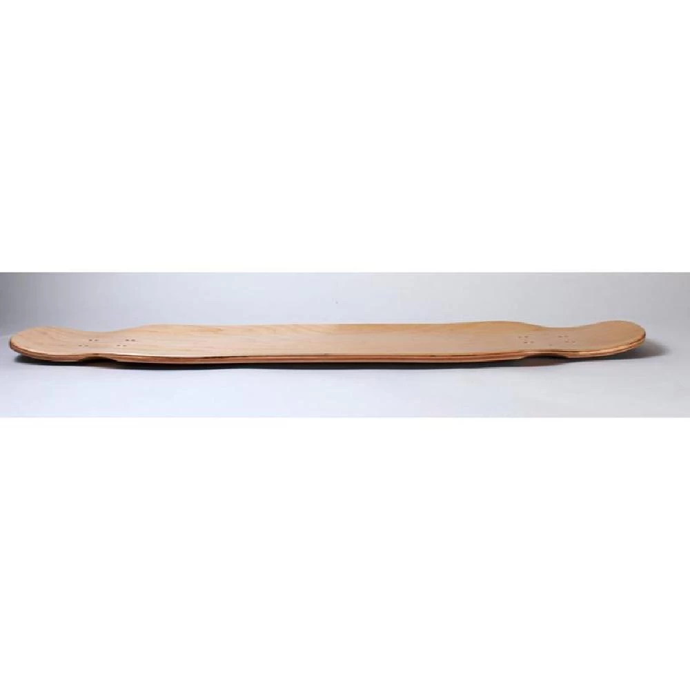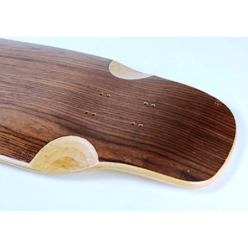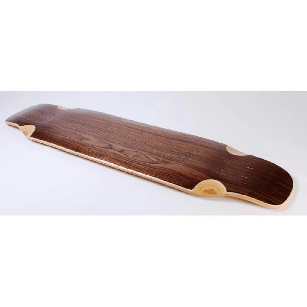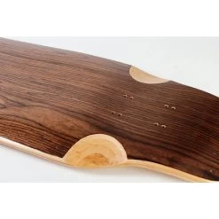 A new board with different wood. Walnut wood is strong. This is our dark walnut kicktail freeride double kicktail deck with single extra large wheel wells. The board has adjustable wheel mount holes for adjusting your wheel base.