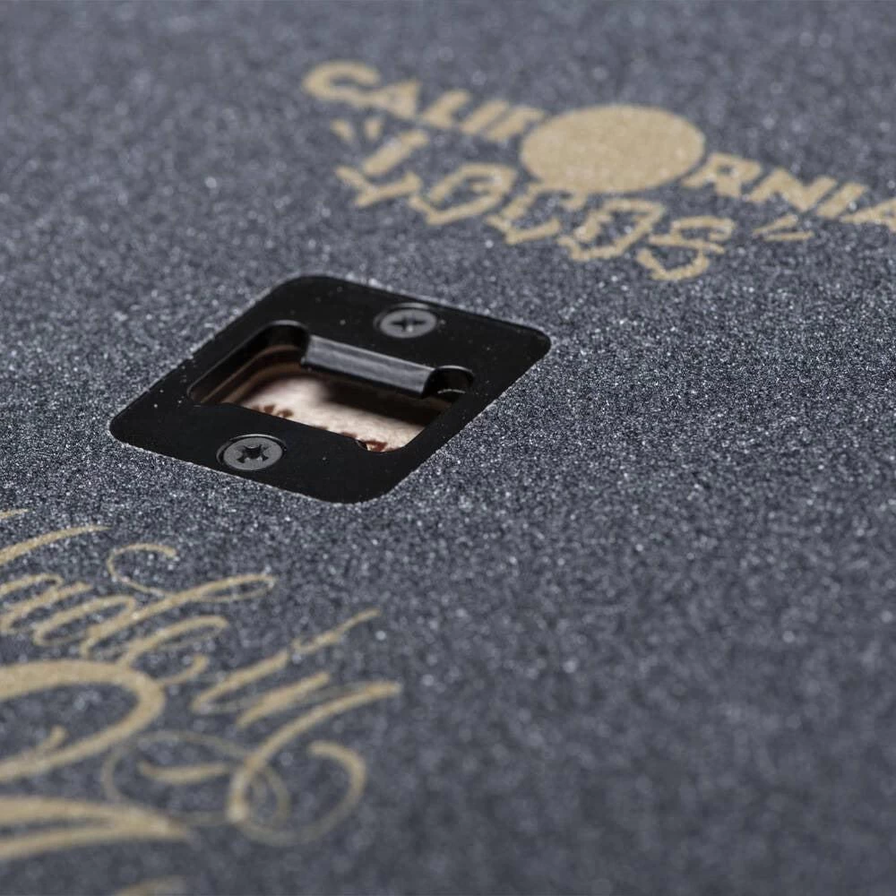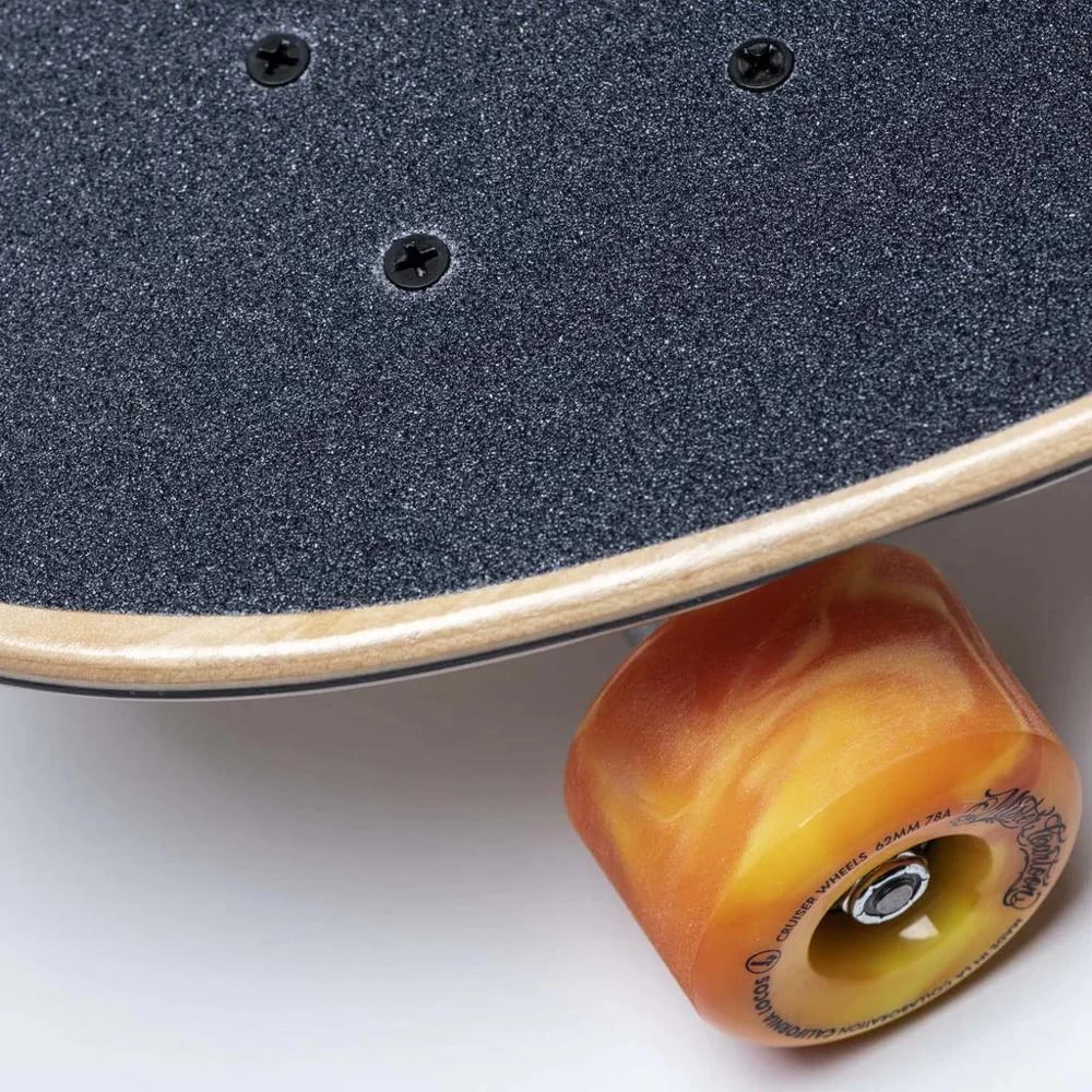 The top of the board uses die-cut, anti-bubble grip tape, keeping the edges clean, and features laser-etched custom logos along with a bottle opener for refreshments after your skate session. These 60mm/78A cruiser wheels complete the look, made with the highest quality urethane and a unique orange and red swirled ink effect.