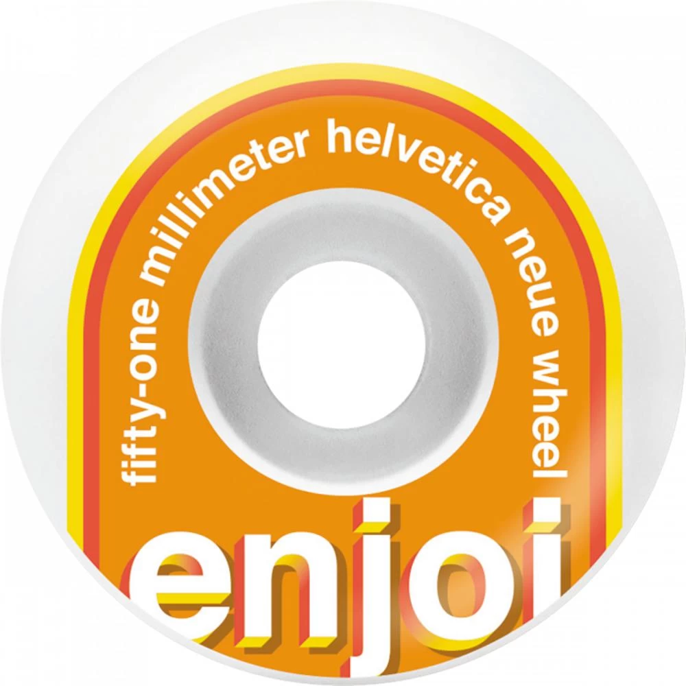 Coming to you with the Enjoi Helvetica 51 mm White/Orange Wheels, the perfect addition to your skateboard setup. These wheels are designed to provide a smooth and speedy ride, while also adding a pop of color to your board. With a diameter of 51 mm, they are the ideal size for street skating and performing tricks. The white color of the wheels adds a clean and sleek look to your setup, while the orange accents add a touch of vibrancy.