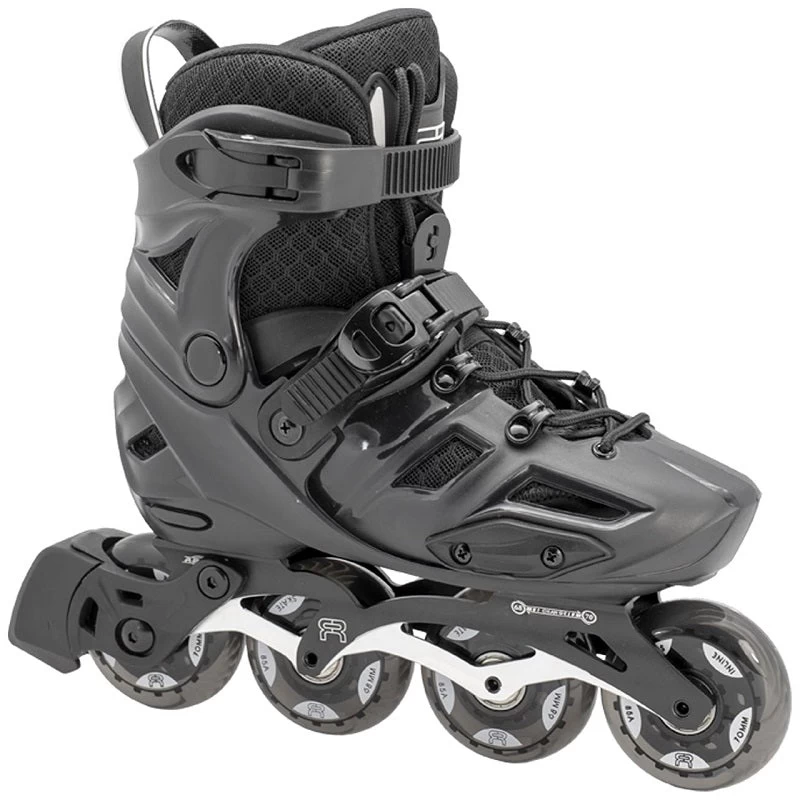 These are the FR Skates AXS Adjustable Inline Skates. These have a solid and supportive hardboot that makes it a perfect skate for both fitness and freestyle skating. The AXS boot comes with a two-buckle locking mechanism as well as a speed lacing system, making this junior inline skate easy to put on and take off. The buckles keep the feet super snug and lock them in for maximum stability and control.