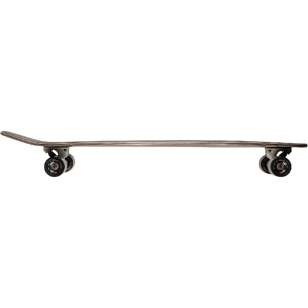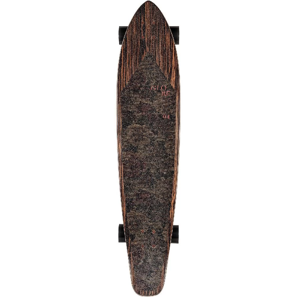 The Byron Bay in colour Ebony/Nightshade comes in size 43″ x 9.5″ x 28.75″wb. Surf-inspired squash tail longboard. It is a Mellow concave with kicktail made of Ebony wood + Resin-8 hard rock maple. It features 150mm Slant reverse kingpin trucks and 70mm 83a wheels. Clear broadcast grip. Fabric inlay.