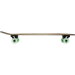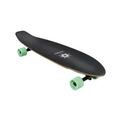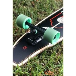 The Globe All-Time in color Skewered comes in size 35.875″ x 9″ x 22.25″WB. Long wheelbase cruiser shape with a kicktail. It is a Mellow concave with kicktail made of Resin-8 hard rock maple. It features 150mm Slant reverse kingpin trucks and 65mm 78a wheels. Black grip tape with print.