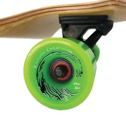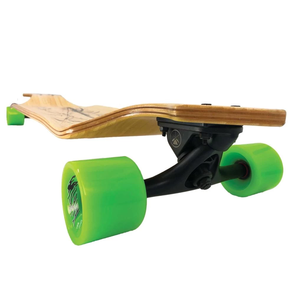 The huge 2″ drop and wide double-concave design make you feel at one with the road. The front of the board is super wide at 10.5″ and tapers towards the tail.