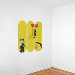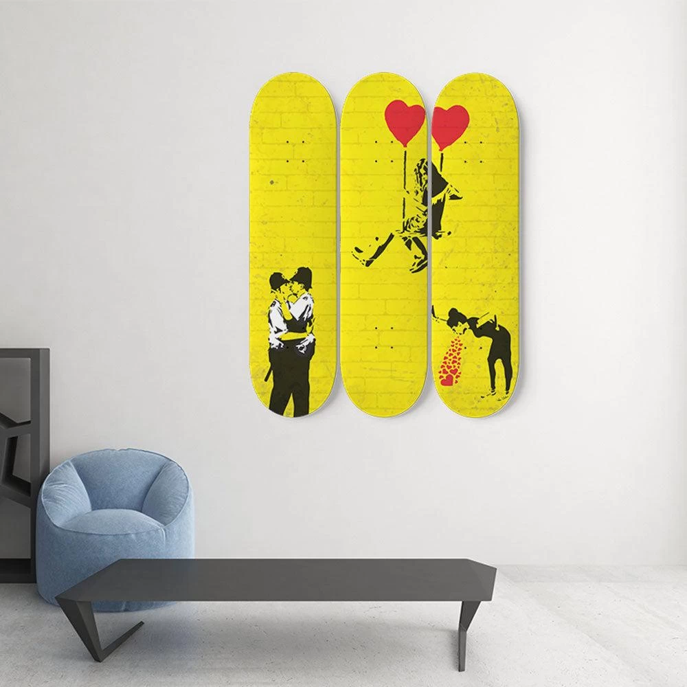 Make your home look beautiful with this skateboard wall decor with a romantic design and an amazing yellow, red, and white color combination in Bansky Grafitti style.