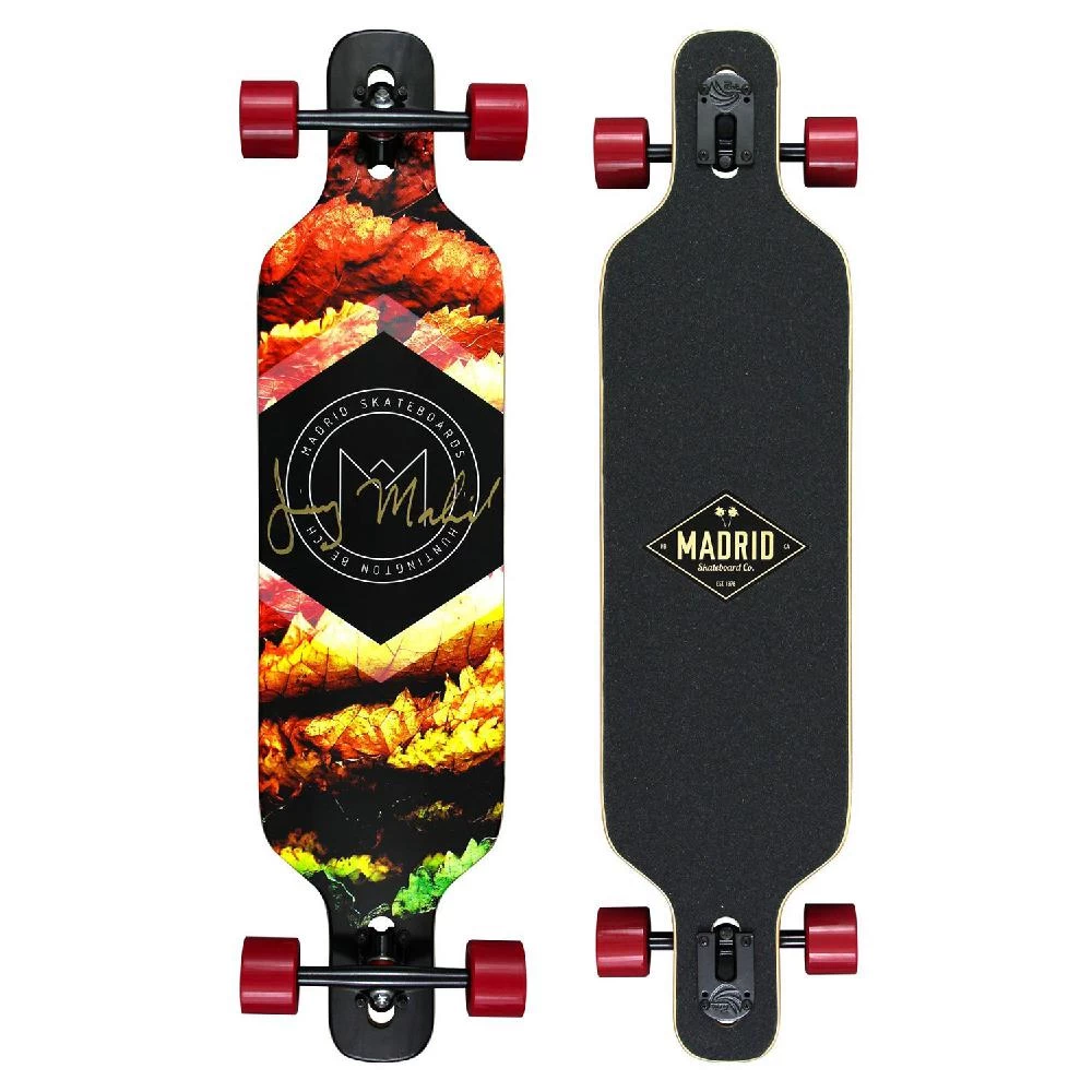 This Carving Cruiser longboard is a drop through longboard. The Madrid Dream 39″ Autumn Drop-Thru Longboard has a symmetrical shape and a rocker W-concave. The complete comes with Caliber 180mm Trucks, Cadillac cruiser and high performance bearings. This drop through longboard comes assembled and is ready to ride!