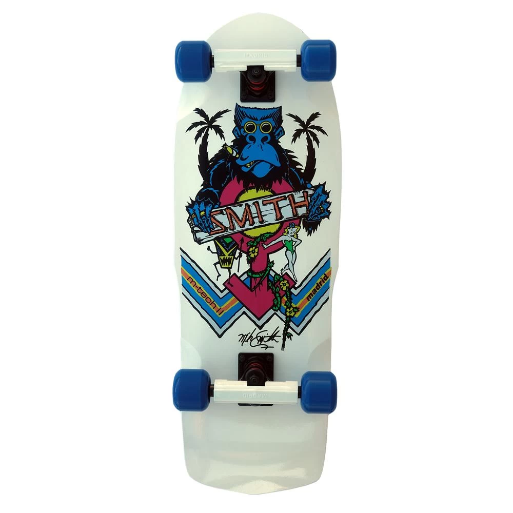 The Madrid Retro Mike Smith Ape 30.75″ Longboard Complete is crafted with a classic and retro design, featuring a unique graphic of an ape holding a surfboard designed by Mike Smith.