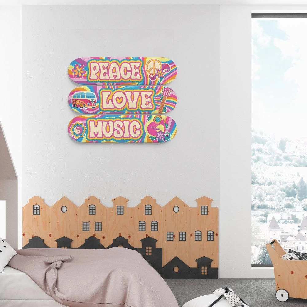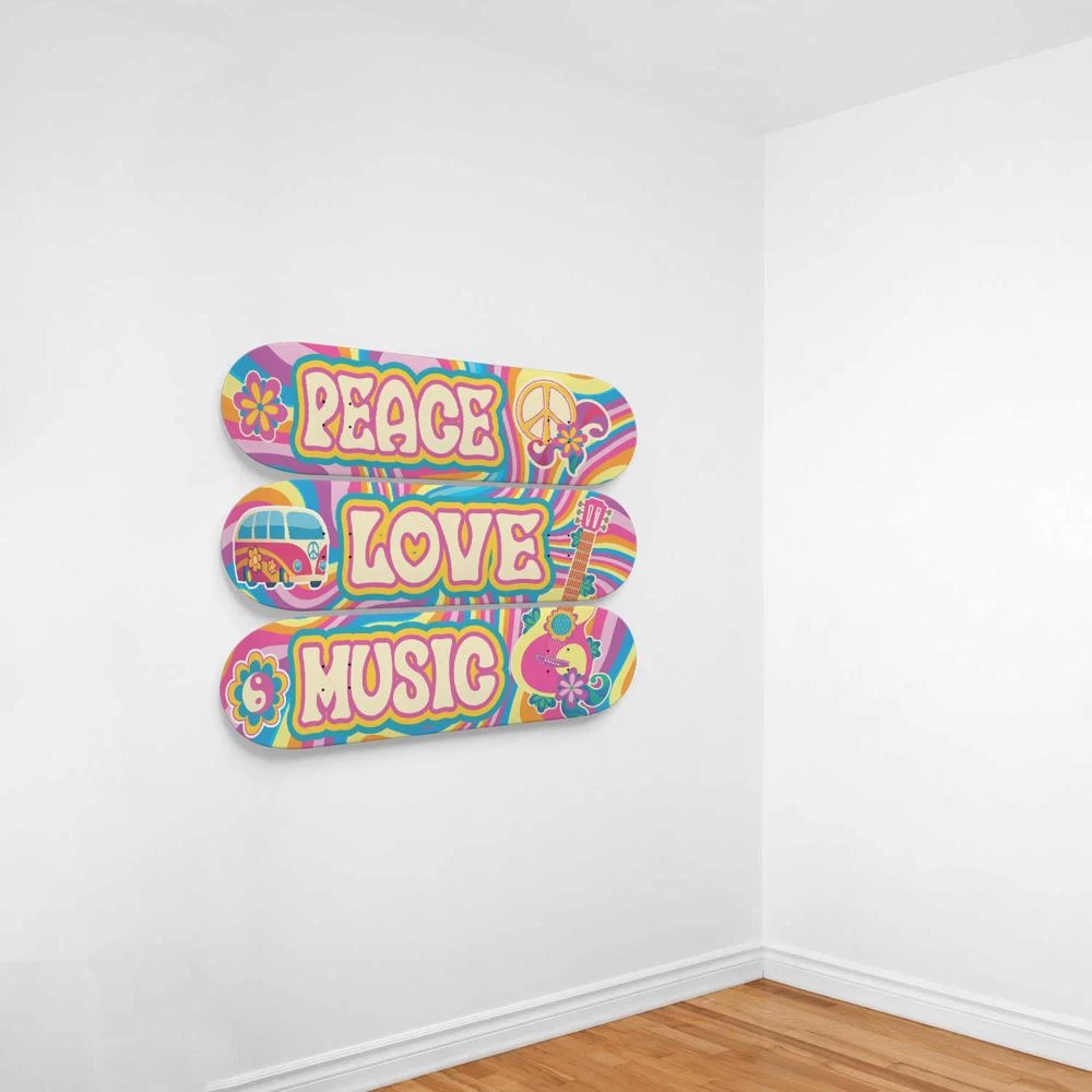 This set of 3 high-quality 7-ply 100% maple skateboards are the perfect statement piece for any home or office. Made to order printed graphics, one-of-a-kind art piece.
