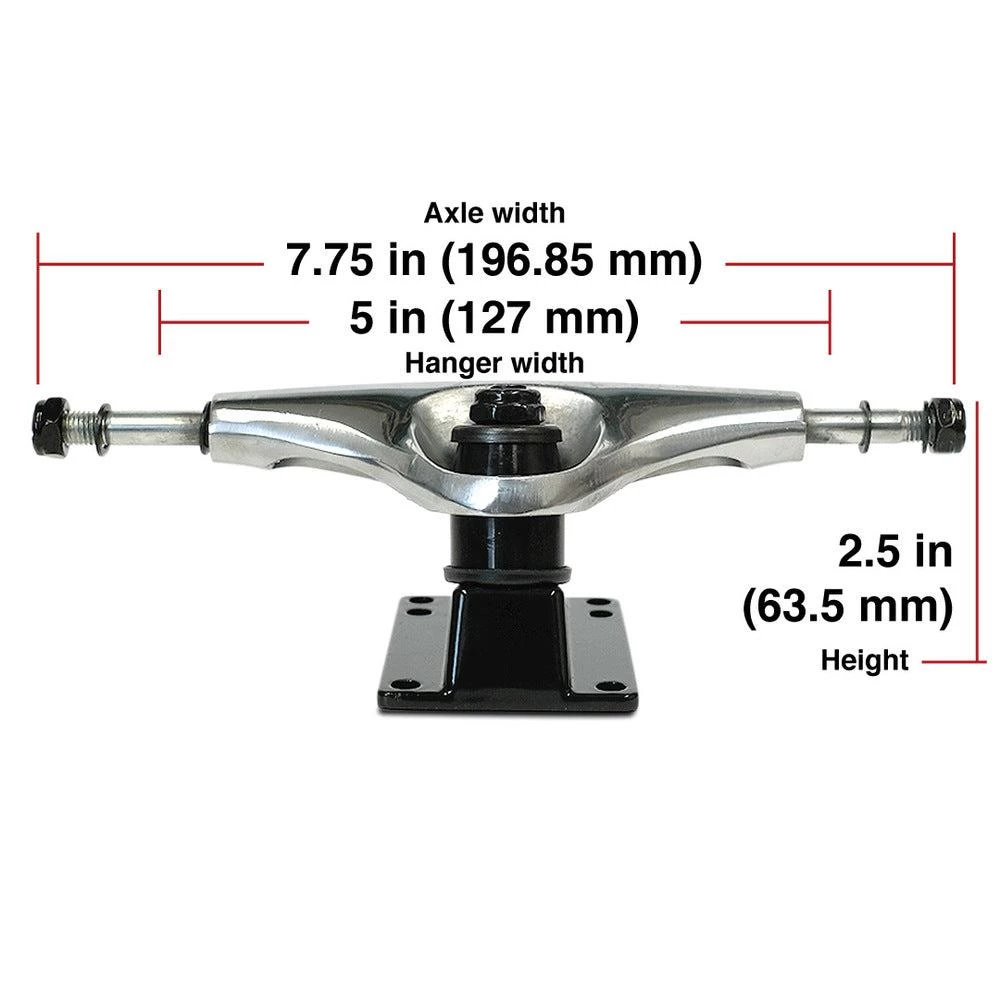 Start rolling and get your hands on a pair of the 125mm – Chrome/Black Skateboard Trucks by Punked.