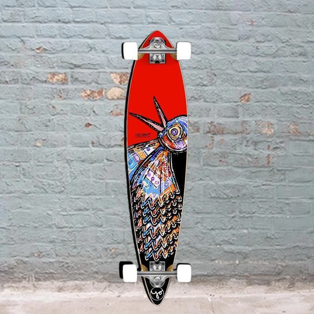 Great beginners Bird pintail longboard in red with a great nature bird graphic. This new pintail longboard is a new 2016 The bird series from Punked. This 40 inches pintail longboard is great for cruising and carving.