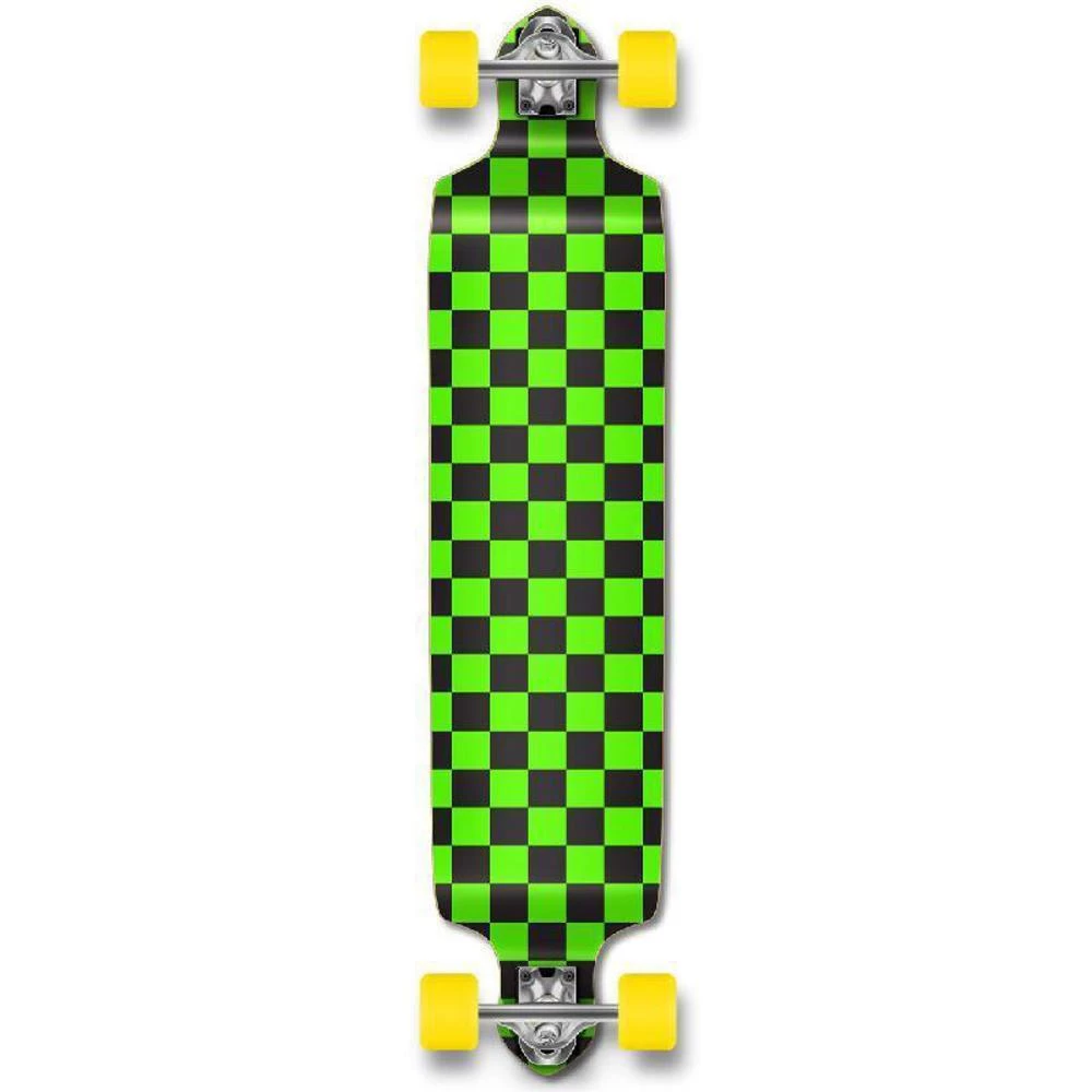 The Complete Checker Drop Down Longboard is designed to provide with the rider with a lower center of gravity since the foot platform sits lower than the trucks. With no flex, the Drop Down is capable of achieving high speed and is perfect for Downhill rider. This great checker pattern can be found in multiple color variations including blue, red, green, purple, white, pink, yellow, orange, and silver checkers. This is the green checkered complete and ready to ride.