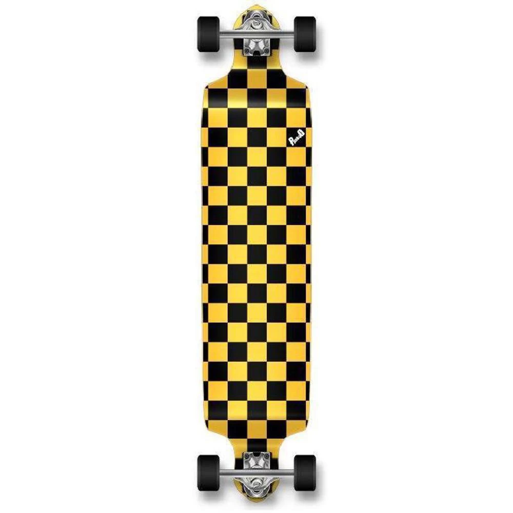 The complete checker drop down Longboard is designed to provide with the rider with a lower center of gravity since the foot platform sits lower than the trucks.