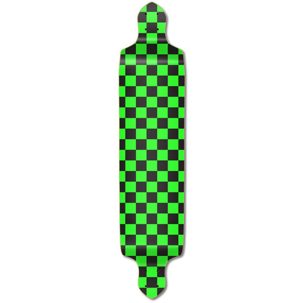 Checker Drop Down Longboard The Drop Down deck is designed to provide with the rider with a lower center of gravity since the foot platform sits lower than the trucks. With no flex, the Drop Down is capable of achieving high speed and is perfect for Downhill riding Checker This great checker pattern can be found in multiple color variations including blue, red, green, purple, white, pink, yellow, orange, and silver checkers