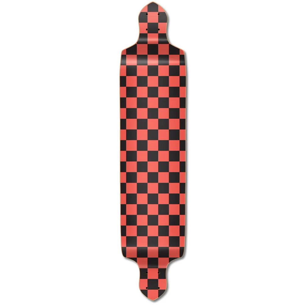 Checker Drop Down Longboard The Drop Down deck is designed to provide with the rider with a lower center of gravity since the foot platform sits lower than the trucks. With no flex, the Drop Down is capable of achieving high speed and is perfect for Downhill riding Checker This great checker pattern can be found in multiple color variations including blue, red, green, purple, white, pink, yellow, orange, and silver checkers
