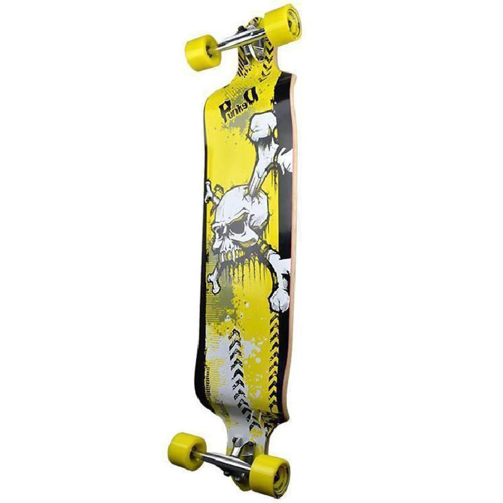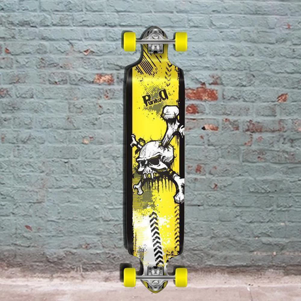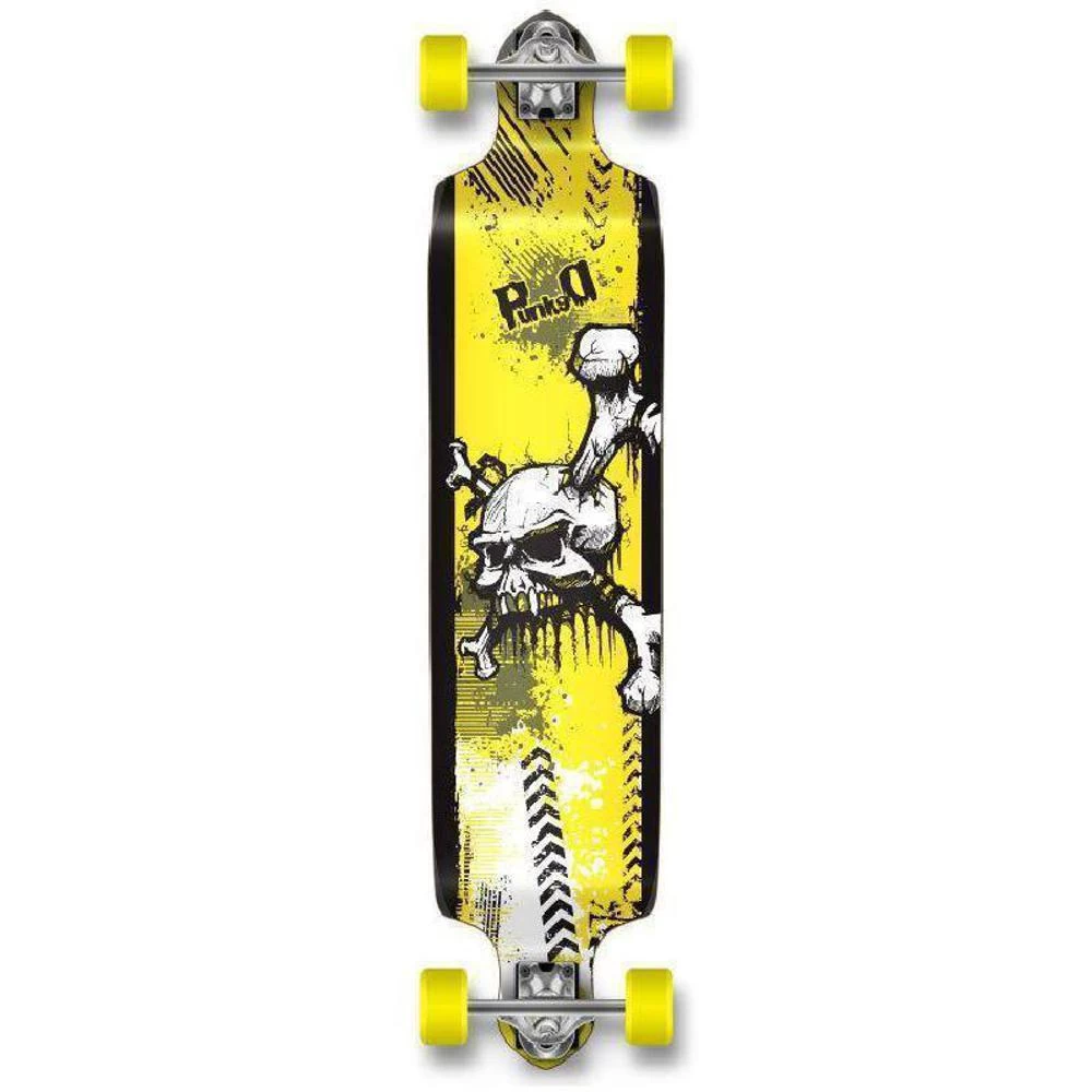 It comes with yellow longboard wheels and the drop-down longboard is made out of 9 ply Canadian Maple. Cool yellow black colors with a skull as graphic, from Punked. This drop-down longboard deal comes complete and is ready to ride when you receive it.