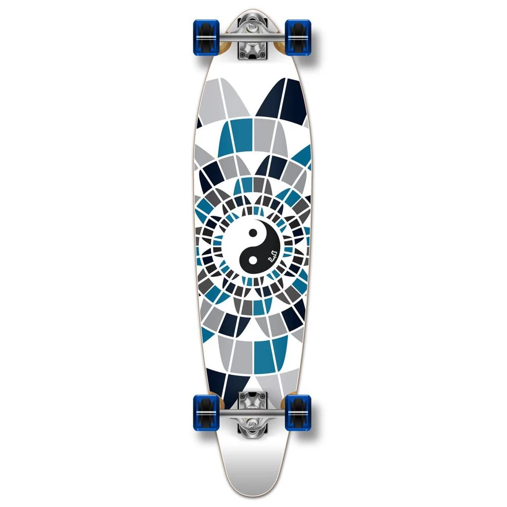 Complete Yin Yang Kicktail Longboard The Kicktail is similar to the pintail shape, but the kicktail shape has a few different features that allow the deck to give the rider more utility. It features a low grade of concave and a kicktail to give riders more control when riding. YingYang This giant yin-yang design is reminiscent of a yin-yangesque flower, blossoming from the center outwards.