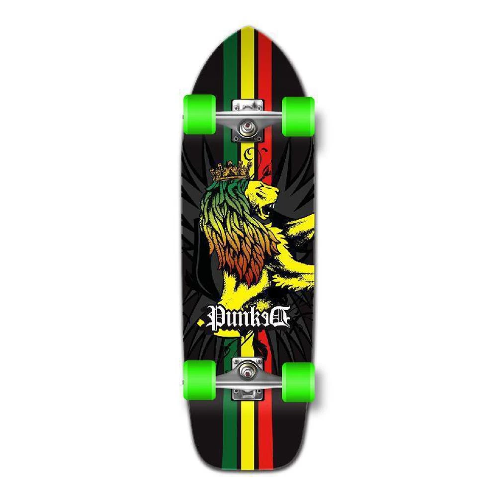 Complete Rasta Old School Longboard The old school board is a classic. The retro style deck features a 16 wheelbase, which is the industry standard for a pool thrasher. With a nose slightly longer than other boards with the same wheelbase, the Old School Cruiser will allow the rider to perform more tricks and the option for different styles of pool shredding. It has old school flavor, with a modern twist. Rasta This graphic depicts a lion colored with a rasta gradient in the foreground and rasta racing stripes in the background