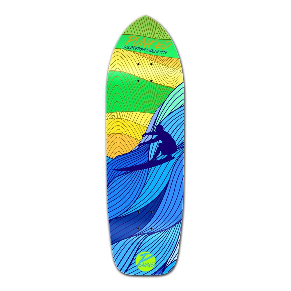 Blue Surf’s Up Old School Complete The old school board is a classic. The retro style deck features a 16′ wheelbase, which is the industry standard for a pool thrasher. With a nose slightly longer than other boards with the same wheelbase, the Old School Cruiser will allow the rider to perform more tricks and the option for different styles of pool shredding. It has old school flavor, with a modern twist. Surf’s Up This graphic is a stylized version of an iconic California scene; enjoying a day at the beach and surfing big waves. Being available on most longboard styles, this design will have you feeling good about carving the street just like you would carve the waves.