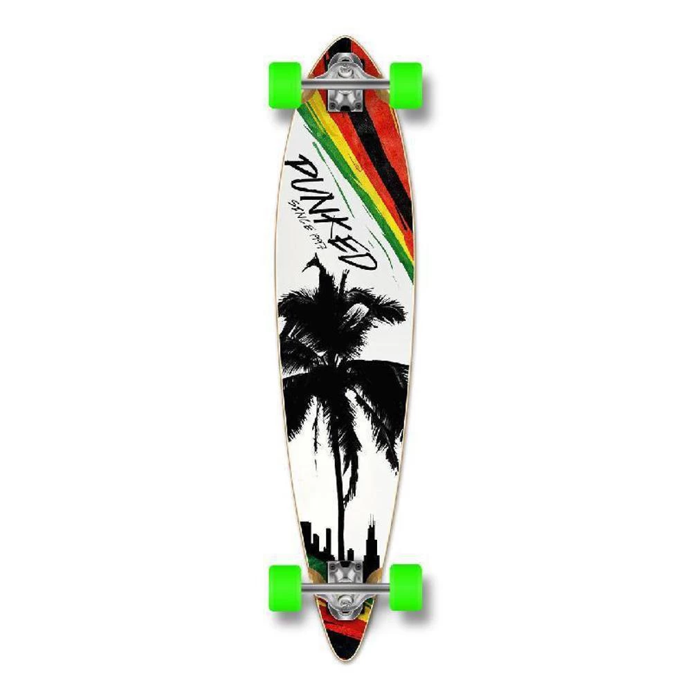 Complete Palm City Rasta Pintail Longboard The pintail teardrop-shaped deck is the most suitable for beginners. The shape prevents the wheel from contacting with the board while still providing ample footspace. Pintails also make excellent campus cruisers. Palm City Rasta This graphic showcases our classic design, a palm tree over a cityscape, with the added touch of Rasta colors. Perfect for casual rippers, cruisers, and those who like to chill and enjoy a ride.