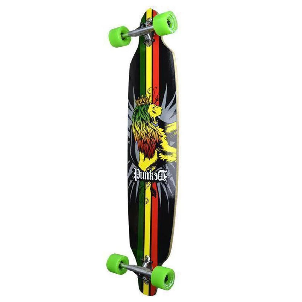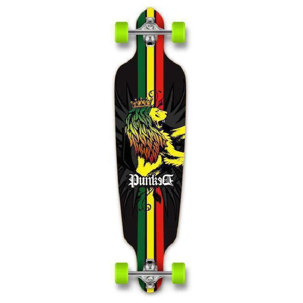 The Punked Rasta Drop Through longboard has cutouts for the trucks so the board is lower to the ground. This gives your more stability at great speeds and is great for beginner riders.