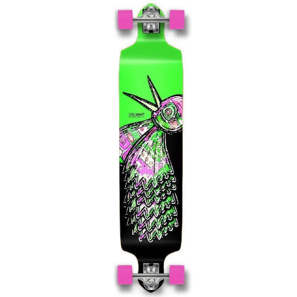 With no flex, this Drop Down deck is capable of achieving high speed and is perfect for the downhill rider. The bird graphic can be found with either a reg, green, or woodgrain colored background. This is the Bird in Green and comes complete and ready to ride.