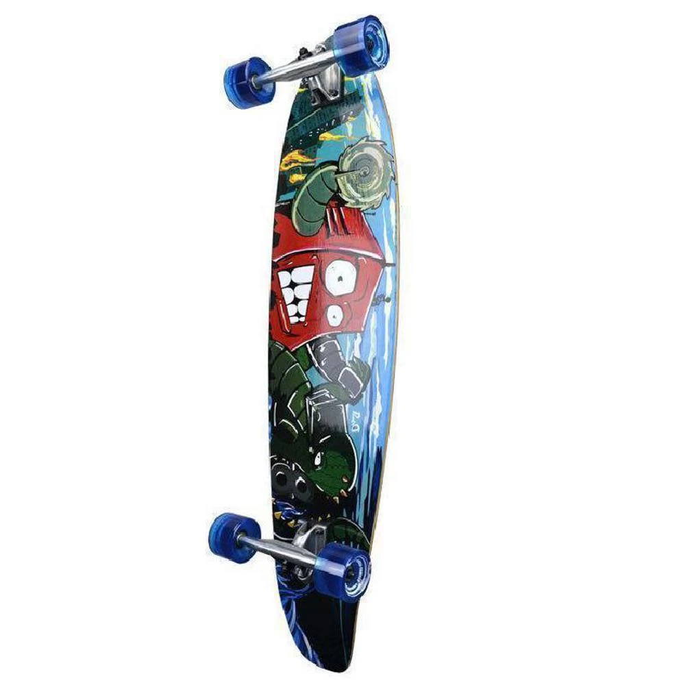 This monster and robot board comes complete with blue gel wheels and is ready to ride when you receive it. This punked robot is a great kicktail longboard deal!