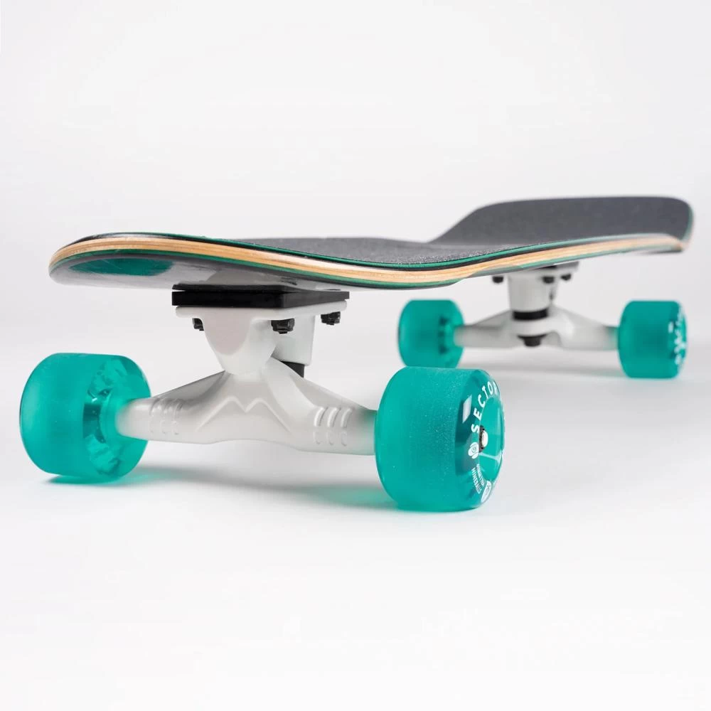 Details like inlayed colored Maple in the bottom ply, checkered die-cut grip and matte, white trucks take these boards to the next level.