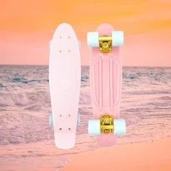 This complete Swell Coral Pink/Gold/White 28″ is a Cruiser Skateboard that easily fits in your backpack to ride any time and any place.